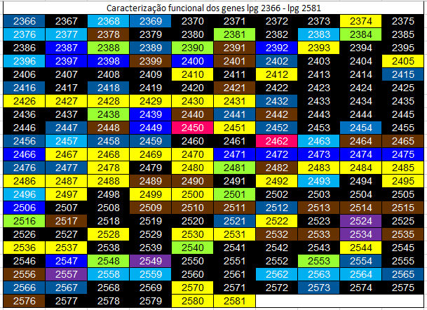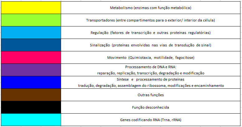De um total de 97 genes inicialmente sem função definida, encontraram-se prováveis funções para 15 deles, ficando assim, de entre os 216 genes, 82 sem função conhecida e 134 com provável função. O mapeamento final dos genes e respetiva legenda encontram-se nas figuras seguintes. Note-se que foi realizada uma nova tabela, tendo em conta os tópicos fornecidos pelo docente para o enunciado complementar.